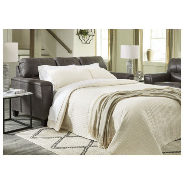 If you love the cool look of leather but long for the warm feel of fabric, you can take comfort in this queen sofa sleeper. Wrapped in a fabulous faux leather with a weathered hue and hint of pebbly texture to resemble the real deal, this decidedly modern sofa proves less is more. Elements include angled side profiling and track armrests wrapped with a layer of pillowy softness for that little something extra. Prominent jumbo stitching and clean-lined divided back styling lend fashion-forward flair. Rest assured, the queen memory foam mattress comfortably accommodates overnight guests.
