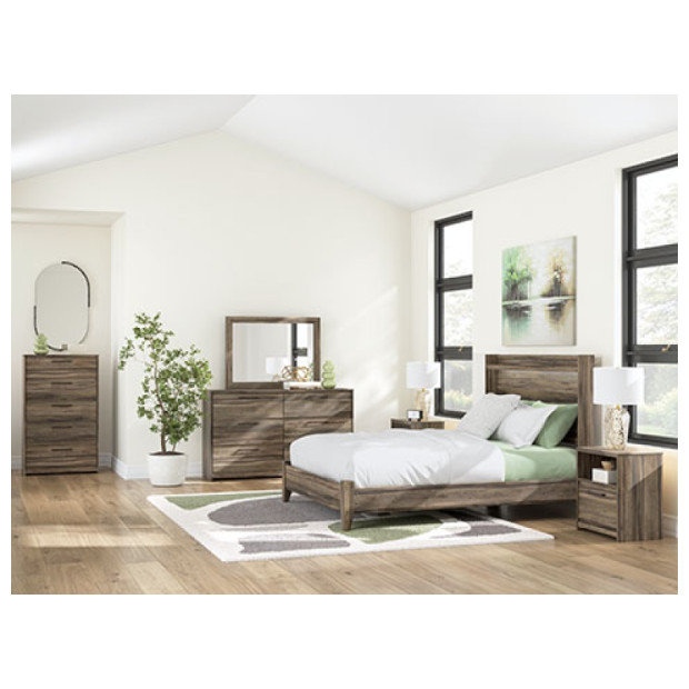 Rest in the casually cool style of this queen panel bed. A weathered brown finish and chill LED lighting create an easygoing vibe, setting the scene in your restful retreat. The bed's clean-lined design provides a fuss-free look. And the dresser's six roomy drawers give you plenty of space for stowing away clothes and more. Set includes queen bed, dresser, mirror, and night stand.