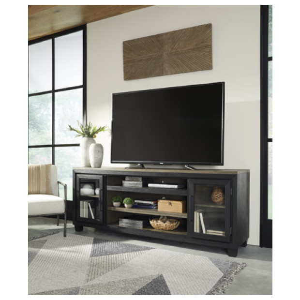 This TV stand is a rustic, casual contemporary style simply done right. Its two-tone color scheme features a rich brushed black finish accented with a dusty grayish brown wood tone. With two glass-front cabinets (each with an adjustable shelf), an open cubby and a removable center shelf, it offers plenty of storage to house all of your electronic needs.