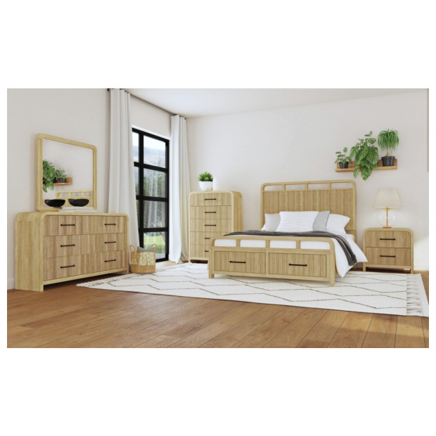 Embrace a blend of modernity and mid-century charm with the Ridgemont Bedroom Collection. This set features a natural finish that highlights the clean, simple lines characteristic of mid-century design, but with a contemporary twist. The queen-size storage bed offers ample underbed storage, perfect for keeping your essentials neatly out of sight. Paired with a sleek dresser, matching mirror, and a nightstand, this collection not only furnishes your bedroom but also enhances its functionality. Upgrade your space with the understated elegance of Ridgemont.