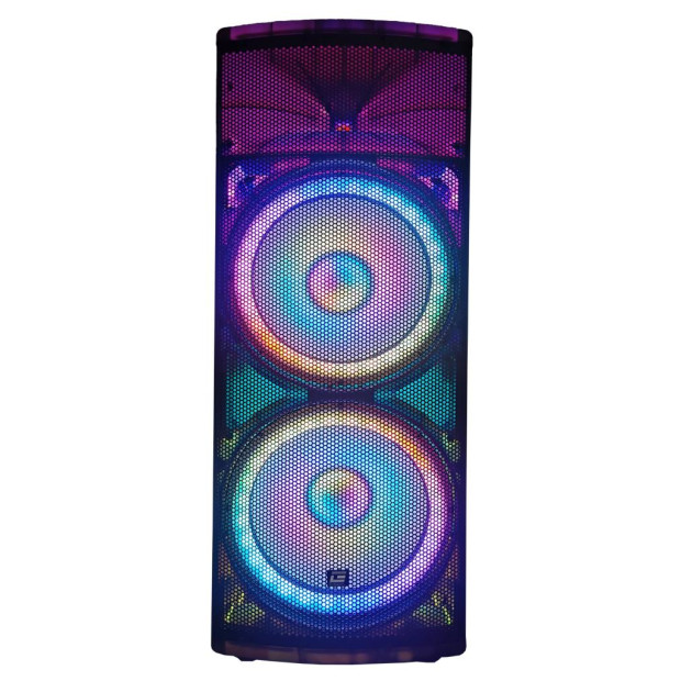 DETAILS STAGE PRO 15 Inch Twin 6000 Watt Speaker with Steel Frame Woofer, Handles & Wheels, Bluetooth, USB, FM, AUX, Microphone, LED Lighting, Remote Included, Translucent Cabinet in Black